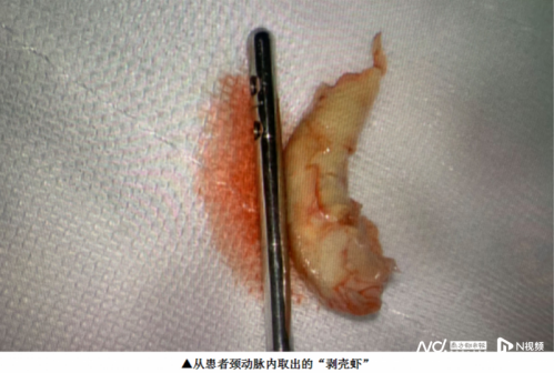 完善相关检查后,4月28日,鲁明带领神经外五科团队决定先为患者行左侧颈动脉内膜剥脱术,确保大脑基本的血供正常。最终,鲁明从患者的颈动脉中取出一块酷似“脱壳虾”的斑块。