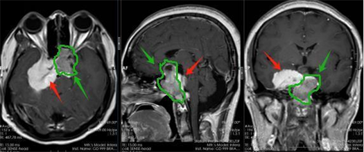 术前影像,其中绿色箭头考虑为垂体瘤,红色箭头考虑为脑膜瘤。