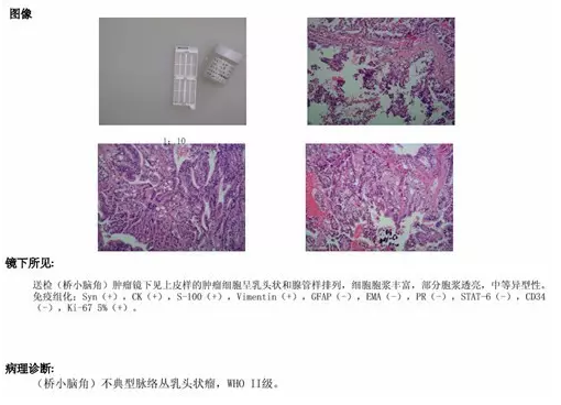 图5:术后病理提示(桥小脑角)不典型脉络丛乳头状瘤,WHO Ⅱ 级