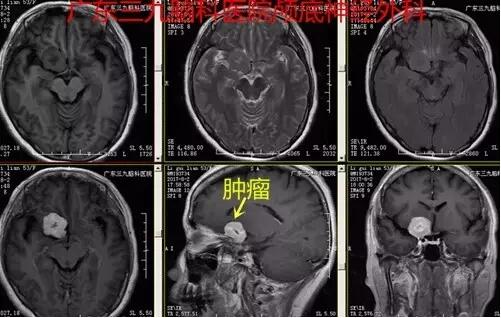 图2:术前磁共振示右侧鞍旁偏上方团块状占位,呈长T1长T2,增强后明显异常强化,中心少许无强化区,大小约2.6cm×2.6cm×2.7cm