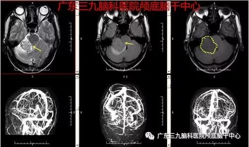 图2:术前CTA检查示右侧桥小脑角区占位性病变内示少许小血管影,邻近右侧大脑后动脉受推挤,相应内听道明显扩大,右侧桥小脑角区占位性病变内存在少许小血管,考虑为听神经鞘瘤可能