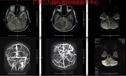 图1:术前CT及CTA结果示脑桥、中脑、右侧桥臂、小脑蚓部、右侧小脑半球示弥漫性病变,其中右侧小脑半球内示少许血管影。