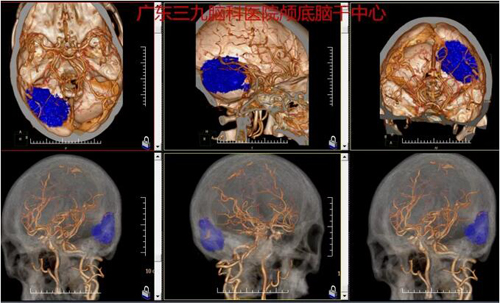 图1:术前CTA结果示左侧后颅窝占位性病变,其内示多发细小血管影,周缘较多血管包绕,邻近左侧大脑后动脉稍受压向右侧移位;双侧颈内动脉虹吸部管壁示多发钙化斑