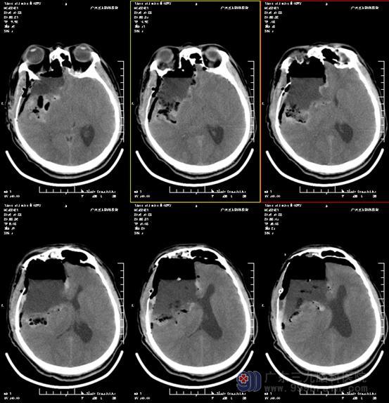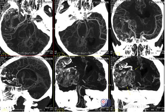 图2:术前CTA检查示:右侧额颞叶巨大高低混杂密度影