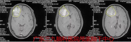 图2:术前MR示右侧额叶占位性病变,强化不明显,混杂信号,大小约5cm*6cm,考虑肿瘤卒中可能。