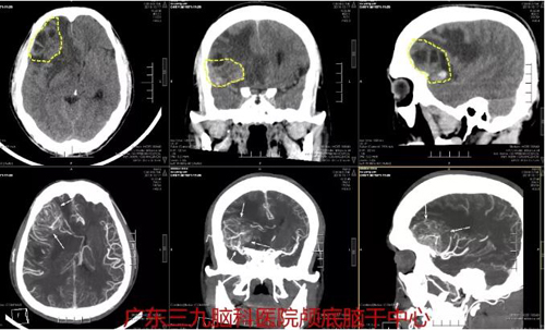 图1:术前CT结示右侧额部团块状的占位,伴有卒中