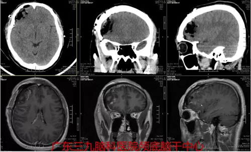 图3:术后CT及磁共振示右侧额叶动静脉畸形切除术改变,结合MRA提示原异常血管团已切除。