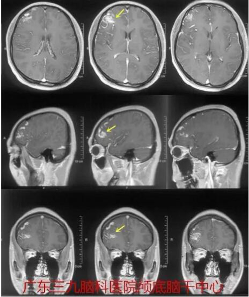 图1:外院术前磁共振示右侧额叶一迂曲血管团。