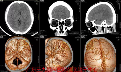 图2:术前CTA检查示:1.右侧额叶动静脉畸形,主要由右侧大脑中动脉上干异常分支供血,相应引流静脉汇入上矢状窦。