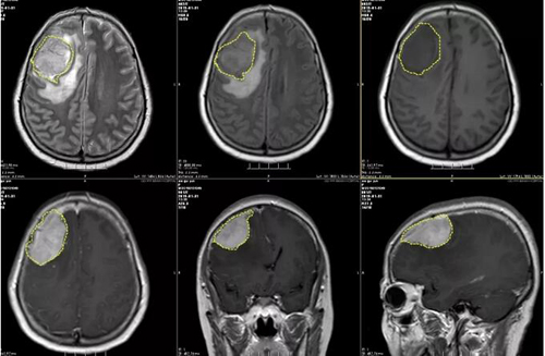 图2:术前MR示右侧额顶部占位性病变,考虑脑膜瘤可能;右侧大脑镰下疝