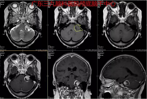 图2:术前MR示左侧桥小脑角区示一团块状长T1长、短混杂T2异常信号影,大小约26mm×23mm×22mm,增强后病灶呈不均匀明显强化,其内示斑片状无强化区。双侧大脑半球皮层下白质内、双侧放射冠及半卵圆中心示散在斑点状等T1长T2异常信号影,FLAIR序列呈高信号。脑室系统轻度扩张。