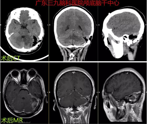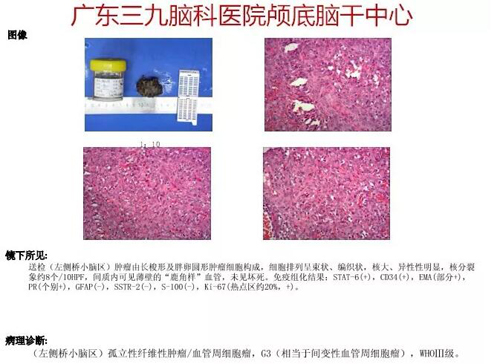 杨某,女,23岁,因“乳腺癌术后2年,间断头晕4个月”于2019年3月8日入院。患者无明显诱因出现眩晕呕吐,外院检查头颅MR示左侧桥小脑角区占位,为进一步诊治,转入广东三九脑科医院神经外一科。完善相关检查后3月12日全麻下为患者行“左侧桥小脑角区占位性病变切除术”,术程顺利,病理报告示: (左侧桥小脑区)孤立性纤维性肿瘤/血管周细胞瘤。