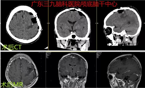 图3:术后CT及MR示左侧顶部非典型脑膜瘤切除术后改变,原病变已切除