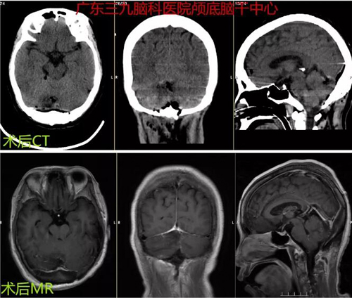 图3:术后CT及MR示右侧枕部占位性病变切除术后改变,原病变已切除
