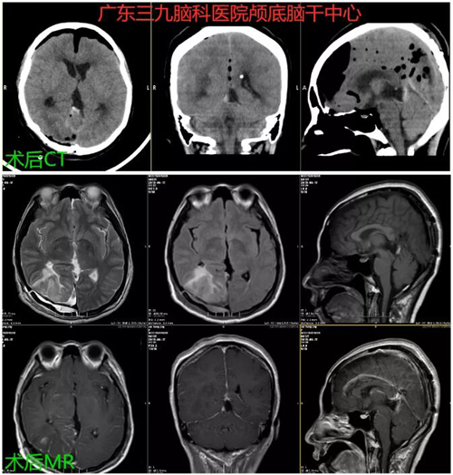 图2:术后CT及MR示:松果体肿瘤切除术后改变,原病灶已切除