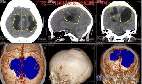 图1:术前CTA示额顶部窦镰旁两侧囊实性占位性病变,范围约8.6×6.6×6.3cm,病变实性部分内示多发细小血管影,邻近上矢状窦中断,邻近颅骨增厚。