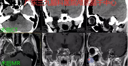 图3:术后CT及MR示右侧中后颅窝病变切除术后改变。