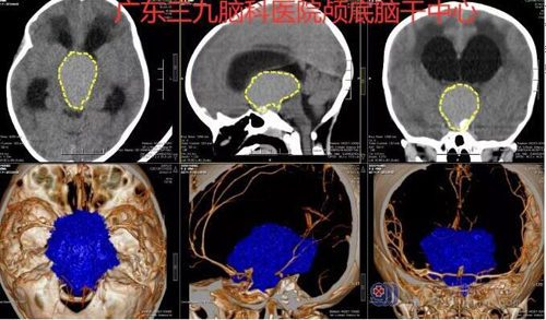 图1:鞍上区占位性病变,其内示小片状极高密度钙化影,未见明确血管影,邻近WILLIS环血管受压明显扩大。