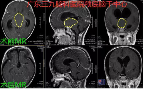 图3:鞍区颅咽管瘤切除术后改变,原病灶已切除。