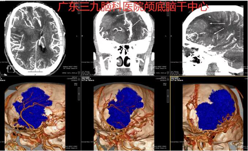 图1:术前CTA示右侧额叶示团块状占位性病变,边界不清,其内示多发异常增粗迂曲血管影,主要供血自右侧大脑中动脉分支,邻近双侧大脑前动脉受压向左侧推移,右侧大脑中动脉受压向后推移;余各脑动脉主干及分支走行僵硬,管壁毛糙,未见狭窄、闭塞、畸形血管及局限性囊状增粗影,左侧大脑前动脉A1段纤细。所见左侧颈内动脉虹吸部管壁示少许斑点状高密度硬化斑块影。