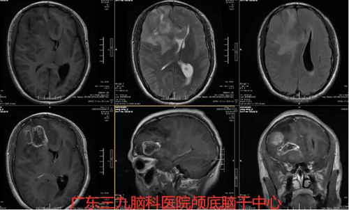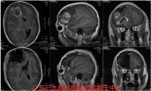图2:术前MR右侧额叶示团片状不均匀长T1长T2信号,FLAIR序列呈稍高信号,增强扫描其内示多发花环状及结节状强化,其范围约为49×43×49mm,周围示大片稍长T1长T2信号,FLAIR序列高信号水肿影,累及胼胝体膝部、右侧基底节、右侧颞叶。右侧侧脑室及左侧侧脑室前角受压并向左侧移位,左侧侧脑室后角稍扩张,周围示少许斑片状FLAIR序列高信号。