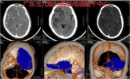 图1:术前CTA示右侧额颞岛叶-基底节区囊实性占位性病变,其内实性部分示少许细小血管影,邻近右侧大脑中动脉受压;双侧大脑前、中与后动脉、所示双侧颈内动脉与椎动脉及基底动脉走行稍僵硬、迂曲,双侧颈内动脉虹吸部管壁示少许钙化斑,余未见闭塞、畸形血管或局限性囊状增粗影