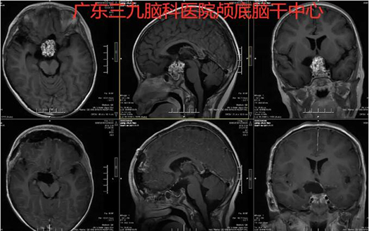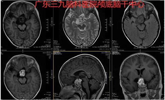 图2:术前MR示右侧颞叶示斑片状长T1长T2异常信号影,FLAIR序列呈内低外高信号,邻近脑沟稍增宽。鞍区示一囊实性占位性病变,实性部分呈不均匀等、长T1等、长T2异常信号影,FLAIR序列呈稍低信号,囊性部分呈长T1长T2异常信号影,FLAIR序列呈低信号,增强后实性部分呈明显不均匀异常强化影,囊性部分未见强化,大小约为4.3cm×3.9cm×3.9cm,垂体及垂体柄、视交叉受压显示不清,病变紧贴双侧大脑前中动脉起始部,双侧大脑前动脉A1段受压移位。