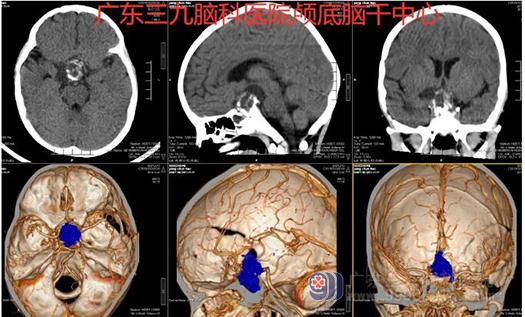 图1:术前CTA示鞍区示一团块状高、低混杂密度影,间杂多发斑片状高密度钙化灶,其内未见异常血管影,病变与双侧颈内动脉虹吸部及双侧大脑前动脉A1段关系密切。