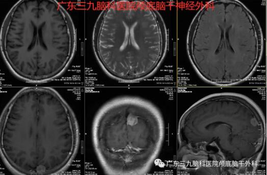 经检查发现:MR示左侧枕顶部上矢状窦旁示一大小约16×15×18mm的结节状不均等T1等、短T2异常信号影,FLAIR序列呈等、低信号影,DWI呈等、稍低或稍高信号,ADC图呈等信号影,增强扫描后呈明显强化,邻近脑膜可见强化;双侧大脑半球皮层下白质内及双侧半卵圆中心、放射冠示散在斑点状等T1长T2异常信号影,FLAIR序列呈高信号。CTA示左侧枕顶部镰旁团块状占位性病变内存在多发小血管,病变紧贴上矢状窦。双侧颈内动脉C1段各示一囊状突起影,大小分别约为右侧6.7×4.1mm、左侧6.4×3.8mm,前交通动脉略显局部隆起。