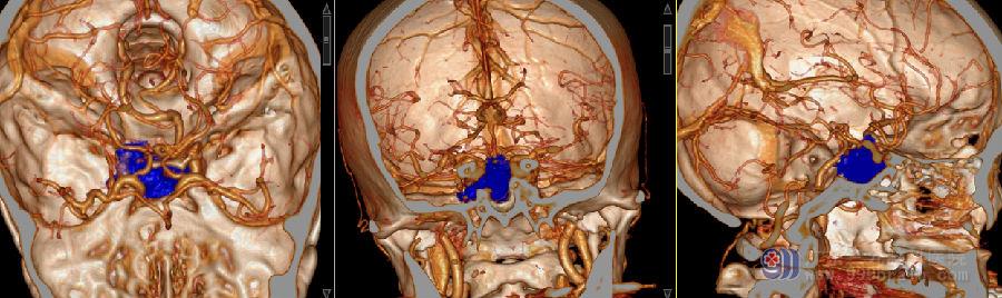 图:1:术前头颅CTA检查示鞍区示一团块状等、低密度影,向下突入蝶窦,病变血供丰富,包绕右侧颈内动脉,左侧颈内动脉受压外移;右侧海绵窦受侵。左椎动脉起源于主动脉弓左颈总动脉后方。右侧椎动脉及颈总动脉开口位置正常。左侧椎动脉较对侧稍细小,未见明显粗细不均。双侧大脑前、中与后动脉、双侧颈总与颈内动脉、右侧椎动脉及基底动脉走行稍僵直,双侧颈内动脉虹吸部示钙化斑。双侧颈内动脉起始部示弧形低密度影。双侧大脑后动脉由后交通动脉供血。甲状腺双侧叶示多发小结节状低密度影。