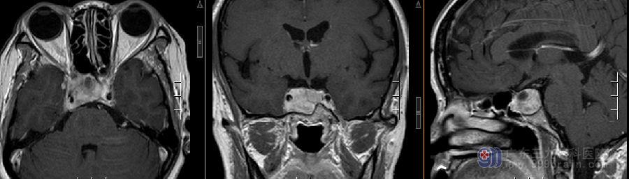 图2:术前MR示鞍区示一团块状囊实性占位性病变,实性部分呈等T1等T2信号,增强扫描明显强化,大小约27×23×19mm,病变包绕双侧颈内动脉,以右侧为著,右侧海绵窦受侵犯。垂体柄左偏,视交叉略受压。鞍底及鞍背骨质吸收变薄。