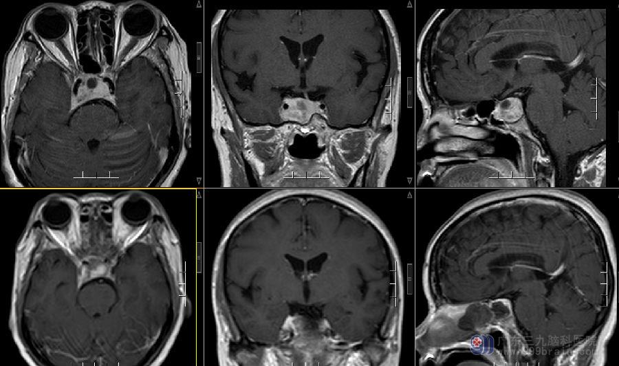 图3:术前术后MR示经鼻道-蝶窦呈术后改变,原鞍区病灶呈切除术后。