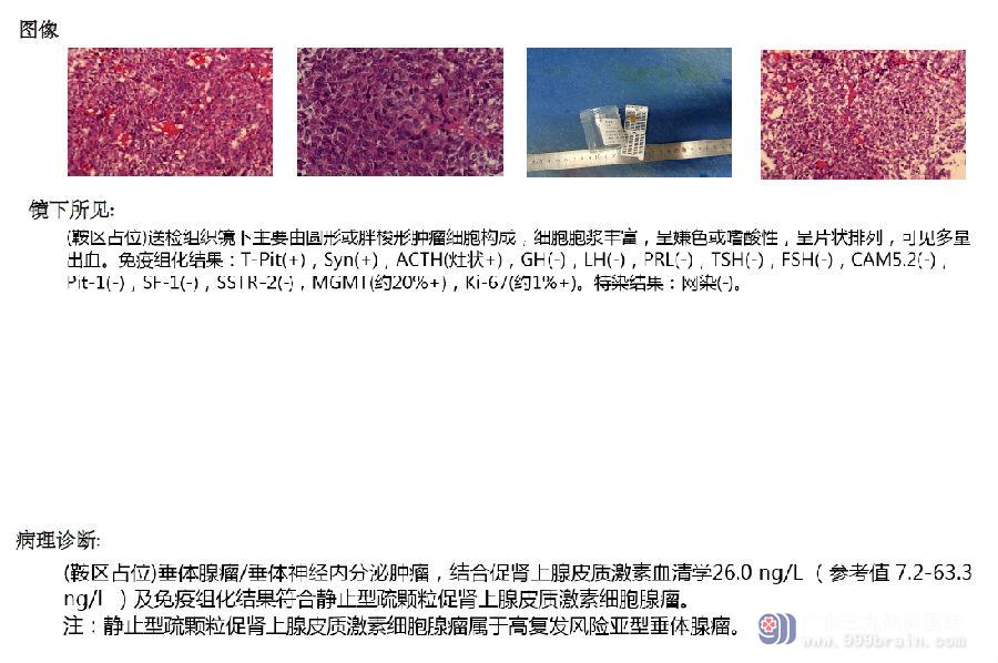 图4:术后病理:(鞍区占位)垂体腺瘤/垂体神经内分泌肿瘤,结合促肾上腺皮质激素血清学26.0 ng/L (参考值 7.2-63.3 ng/L )及免疫组化结果符合静止型疏颗粒促肾上腺皮质激素细胞腺瘤。注:静止型疏颗粒促肾上腺皮质激素细胞腺瘤属于高复发风险亚型垂体腺瘤