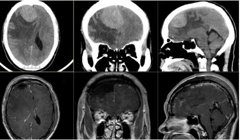 阿明今年48岁,像往常一样刚刚工作完回家吃饭,突然间头痛剧烈并出现干呕。以为是感冒受寒突然引起的,未引起重视,但是家人还是不不放心,立即带去当地医院。检查头颅CT示右侧额部占位性病变,瘤周水肿严重,当地医生建议上级医院继续治疗。