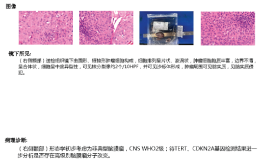 术后病理提示:初步报告:(右侧额部)形态学初步考虑为非典型脑膜瘤,CNS WHO2级。术后MRI提示:右侧额部占位性病变切除术后改变。