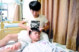广州日报讯 (全媒体记者梁超仪 通讯员胡誉怀摄影报道)日前,在哥哥方坤锦的陪伴下,16岁的小伙子方坤鹏从揭阳来到广州治病,确诊为脑肿瘤。昨日记者获悉,方坤鹏已暂时出院回老家休养。方坤锦介绍,弟弟的病情需要尽早动手术,如今一家人四处奔波筹集医药费,希望能够帮助他熬过这一难关。