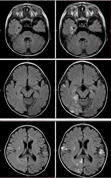 患儿于2014年(出生后6-7月)反复发热1周,体温最高大于39℃之后出现发作,表现为:意识不清,四肢强直抽搐,脸色嘴唇变紫绀,持续约10分钟缓解。2017年(3岁半)出现第2次发作,表现为睡眠中左侧肢体抽搐,持续10余秒后缓解。2018年7月反复出现低热,2018年7月25日再次出现发作,表现为双眼向左侧凝视,左侧颜面部、眼部抽动,持续2-3分钟,丛集出现,间隔10余分钟再出现,有时伴左侧肢体抽搐,到当地医院予镇静处理后方停止,整个过程持续5小时余。发作前反复呕吐胃内容物。到当地医院就诊,行腰穿检查,常规生化未见明显异常,诊断考虑脑膜脑炎,予丙种球蛋白(总量15g)治疗,未进行抗癫痫治疗,今为求进一步诊疗前来广东三九脑科医院癫痫科就诊。