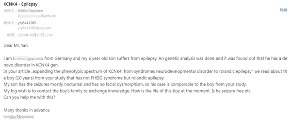 近日,我院神经内三科(癫痫内科)闫宏钧副主任医师收到一封特殊的邮件,邮件来自德国的一位家长。这位家长表示,他看到我院神经内三科团队在Frontiers期刊上发表的关于KCNK4基因突变导致良性癫痫的首例报道后,发现自己孩子的病情与报道描述的症状极其相似,为此想求助于闫宏钧。