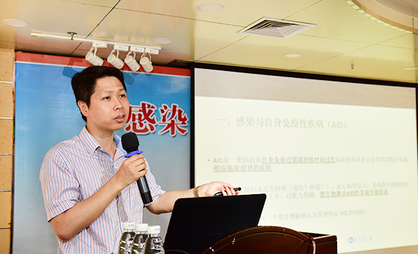 邱伟教授围绕《感染与视神经脊髓炎偶然还是必然?》这一议题展开丰富的学术演讲,并提出未来研究NMO与感染需关注的问题。