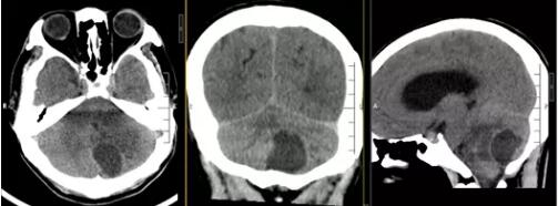 ▲术前CT:左侧小脑囊实性占位,周缘水肿,脑组织受压,后颅窝肿胀明显
