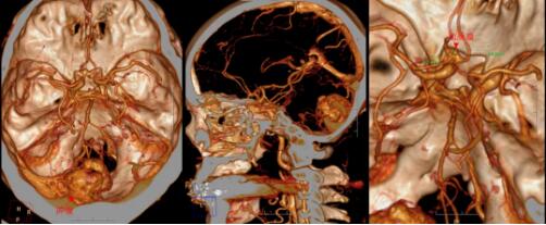 血管母细胞瘤是一类血供极为丰富的肿瘤,实质性血管母细胞瘤尤甚。术前完善的CTA检查,了解肿瘤血供相当必要。进一步的头颅CTA检查提示肿瘤的血供极为丰富,存在有多处供血动脉。然而,屋漏偏遭连夜雨,CTA检查还发现患者的前交通动脉上鼓了个小泡——也就是动脉瘤,也就是常常被脑外科大夫们形容为“不定时炸弹”的颅内病变,病死率相当高!