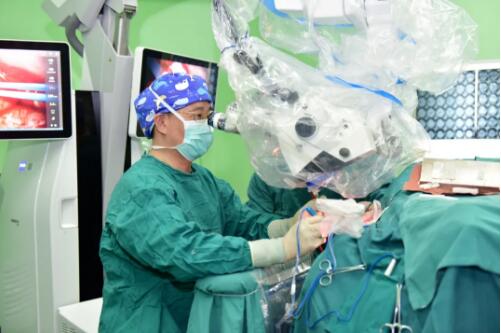 神经血管介入科主任王培明先行肿瘤部分供血血管栓塞后,欧阳辉主任带领团队对患者的左侧小脑肿瘤进行了手术切除。