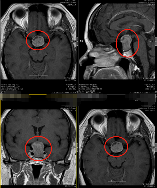 廖阿姨入院后很快就安排了检查,其神经系统查体未见明显定位体征;我院颅脑MR垂体平扫+增强示::鞍区及鞍上区病变,考虑垂体大腺瘤合并囊变(Knosp2级,颈椎腰椎MR提示可见椎间盘突出改变,考虑其肢体麻木与颈腰椎病有关。其头晕头痛为鞍占位区病变所致。