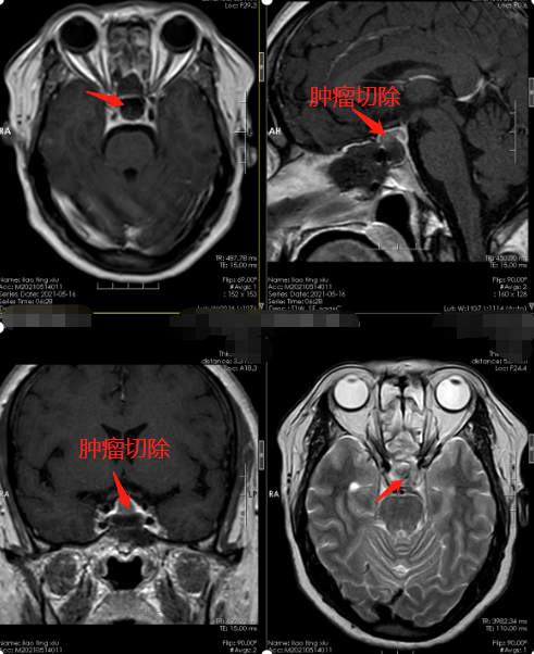 明确诊断后廖阿姨由内科转至神经外十科治疗,5月10号廖阿姨在全麻下行“神经内镜下经鼻蝶入路鞍区垂体瘤切除术”,术中磨除鞍底骨窗约1.5cm大小。钩刀“+”字型切开硬脑膜,见肿瘤灰白色,质硬,正常垂体组织位于右后方,予以保留,全切肿瘤,双侧海绵窦内侧壁无肿瘤残留,无明显脑脊液漏,术腔内留置明胶海绵片,检查无明显出血。术后安返监护室,给予止血、护胃、营养神经等对症和支持治疗。手术过程很顺利,肿瘤全切。