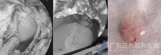 在内镜的清晰视野下,医生们清晰地看到延髓颈髓交界区背侧、颈1椎管内的囊状占位,幸运的是,该占位与延髓颈髓无明显粘连,只是边缘可见数个小血管。手术团队沉着冷静,精准分离,成功取出囊状占位及所有囊膜。手术过程顺利。