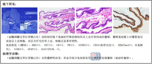 术后MR检查显示,原延髓颈髓交界区后方椎管内病变已成功切除。病理结果提示为符合神经管原肠囊肿(肠源性囊肿)。出院时,罗昊神志清醒,对答如流,四肢肌力恢复如初。