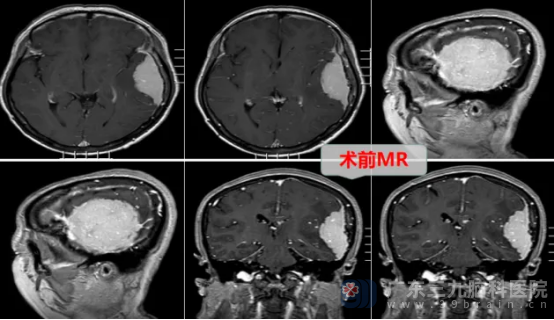 上个月的一天,王女士在洗澡时,突然感觉一阵天旋地转的感觉袭来,脚步猛地踉跄了一下,身体不受控制地往旁边歪斜,并同时还伴有毫无逻辑的胡言乱语。家人见状,心急如焚,赶紧将她送往当地医院就诊,头颅MR检查提示“左侧额颞部占位,考虑脑膜瘤”。药物治疗虽让王女士的言语功能有所恢复,但为寻求进一步诊疗,王女士在家人陪同下来到广东三九脑科医院神经外十科。
