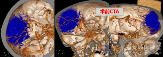 入院时,患者的言语仍偶有混乱。我院神经外十科专家为患者完善相关检查后,发现患者的左侧额颞顶部颅骨内板下占位侵犯邻近颅骨,范围约78mm×26mm×66mm,周围脑叶水肿且可疑受累,占位血供丰富,怀疑是不典型脑膜瘤可能性极大。