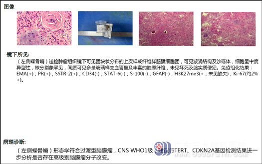 曾姐感觉头颈部疼痛不适,刚开始,并没放在心上,想着顶多也就是肩周炎或者是颈椎病,没想过:“自己那么年轻,还会有什么脑病?”,心想休息休息就好了,但是这次却出乎意料,都几周了头痛还不见改善,曾姐就不得不去了当地医院就诊,医生为她做了头部MR检查,真是:不做不知道,一做吓一跳,MR示“左侧蝶骨嵴脑膜瘤”,这下曾姐真被吓到了,才30多岁,医生说要尽快手术,要开颅,曾姐和家人害怕的不得了,主要是担心术后恢复不好,她还这么年轻,怕成为家里的负担,曾姐的家人经多方打听,得知广东三九脑科医院神经外十科欧阳辉教授团队是国内权威的脑科团队,于是就慕名到广东三九脑科医院就诊,主管医生邓心情拟“左侧蝶骨嵴脑膜瘤”收入我科。