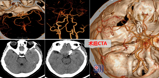 在完善相关检查后,外十科主任欧阳辉教授组织进行了详细的术前讨论,邓心情医师向家属交待了病情,说明手术的必要性和手术风险,在取得病人及其家属理解并签字同意后,外十科团队在全麻下为黄阿姨进行了左侧颈内动脉眼动脉段动脉瘤夹闭术。全麻成功后,取左侧翼点入路,咬除部分蝶骨嵴,从硬膜外细心暴露并磨除前床突,再剪开硬膜,在高清显微镜下释放侧裂池脑脊液,显露左颈内动脉、视神经,在床突段可见宽颈囊性动脉瘤,锐性分离动脉瘤周围粘连,暴露并保护动脉瘤,充分显露动脉瘤颈后精准地用动脉瘤夹将其夹闭,检查周围动脉保护完好,载瘤动脉通畅。手术顺利,麻醉满意,出血不多,术后病人全麻清醒,安返病房。